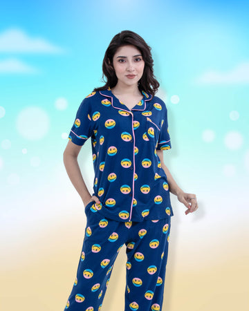 Women's Blue Smiley Face Printed Pyjama Set,Night wear Dress Women's Aop Printed Night Suit Set Shirt & Pyjama | Soft Nightwear Dress, 2 Piece Sleepwear for Women's,