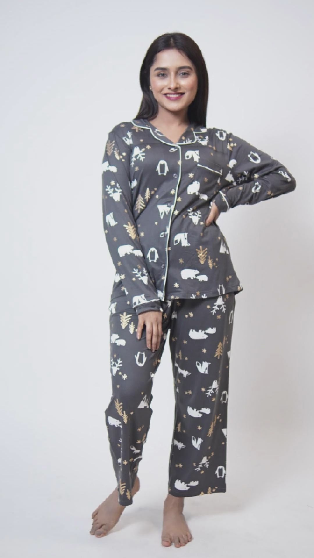 Women’s Christmas Printed Pyjama Set – Dark Grey All Over Print Sleepwear with Long Sleeve Top & Pants