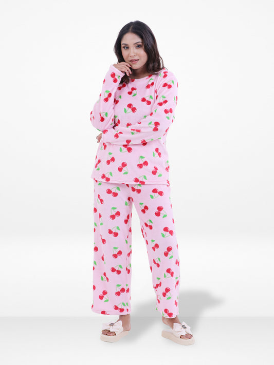 Women’s Cherry Printed Pyjama Set – Long Sleeve Top & Pants, Soft Comfortable Sleepwear, Cozy Winter Loungewear for Women