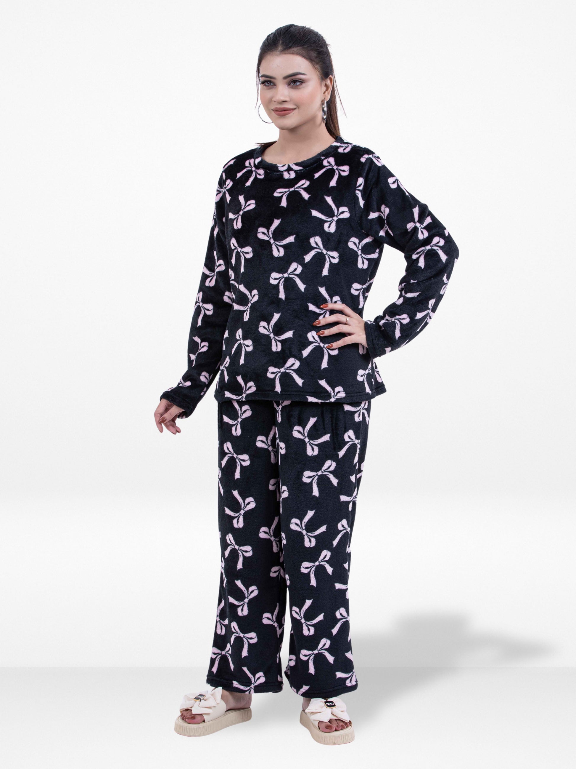 Women Bows Printed Pyjama Set – Long Sleeve Sleepwear | Cozy Winter Loungewear for Women