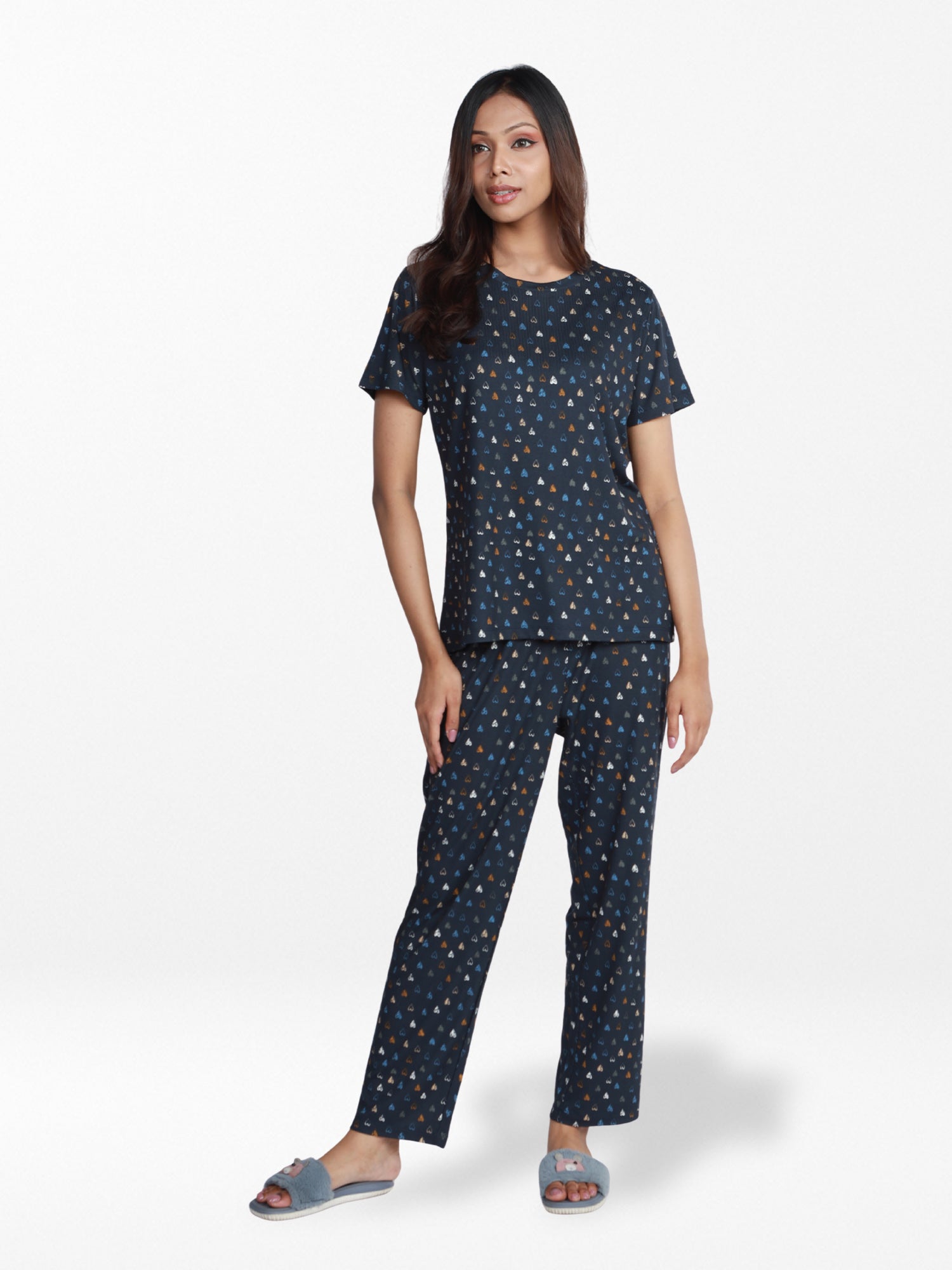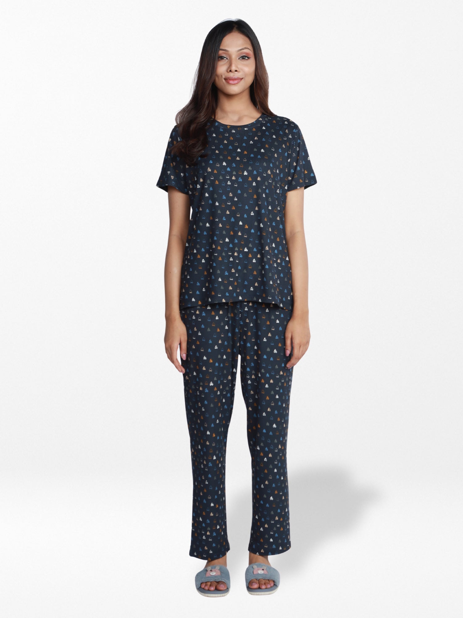 Woman wearing a navy blue pajama set with a subtle pattern on a white background