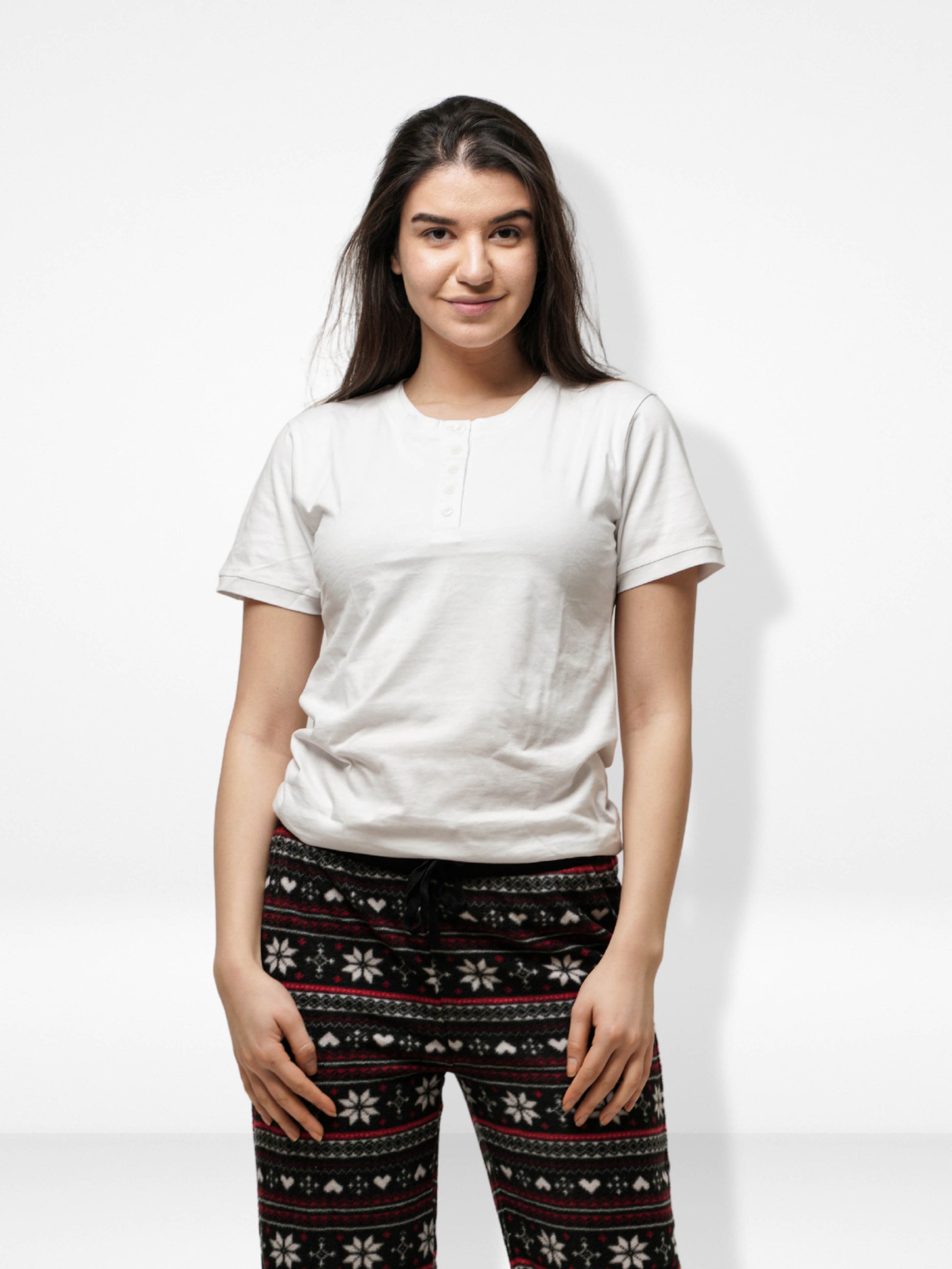 This women's white round neck T-shirt features a classic, minimalist design perfect for everyday wear. Crafted from a soft and breathable cotton blend, it offers a comfortable regular fit with short sleeves and 5-button placket , crisp white color that pairs effortlessly with any outfit. Ideal for casual wear, layering, or lounging.